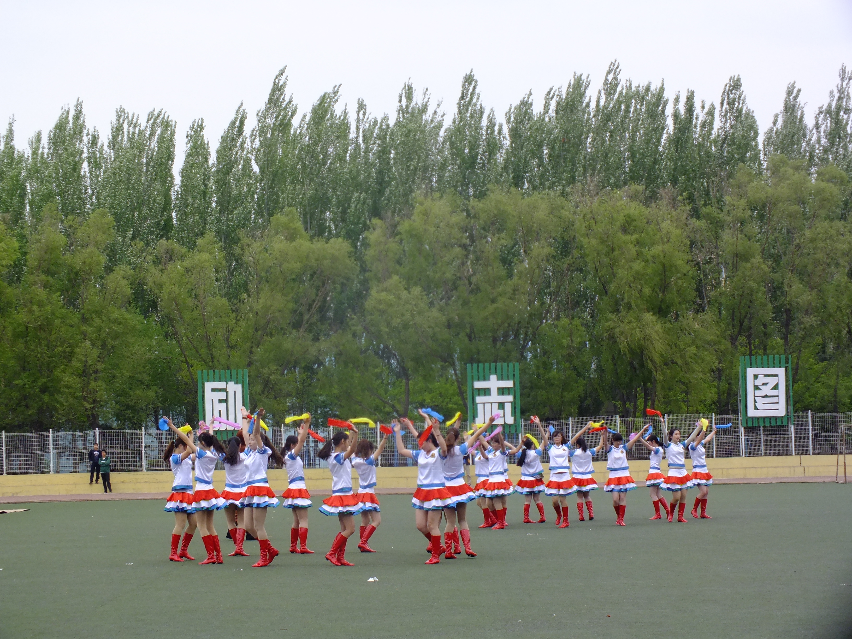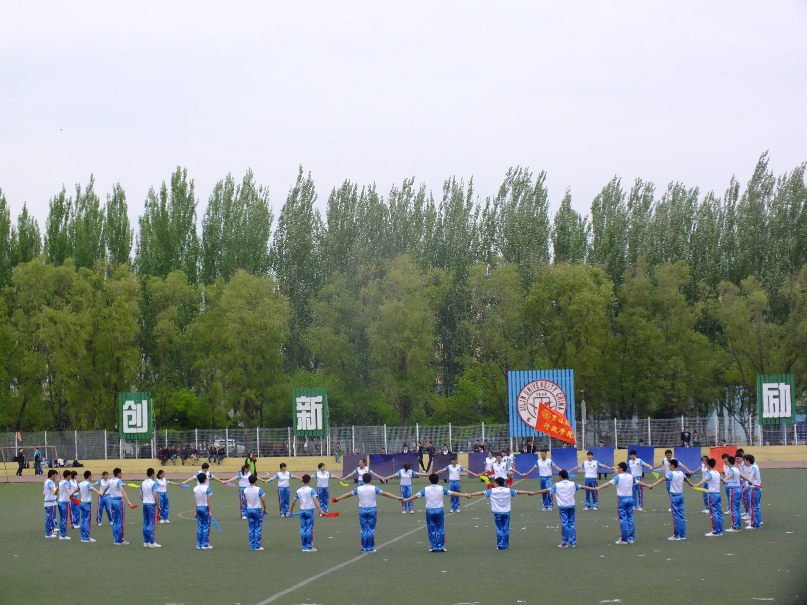 随着一声响亮的口号,同学们迈着整齐的步伐在一片欢呼声中进入比赛场地,大舞的帷幕随即拉开。今年yl23455永利的大舞颇具创意,不仅使用了两种道具,变换了三首背景音乐、五次队形,还融入了当下较流行的“快闪”元素,让在场的观众和评委眼前一亮。首先同学们重现了著名音乐剧《音乐之声》的片段,男生和女生共围成八个圆圈,伴随着欢快的背景音乐,整齐划一的动作引来阵阵掌声。随后经过同心圆、三角阵等队形变换,在“party rock rhythm”的背景音乐下,同学们将街舞与健美操完美结合,顺利完成了第二部分的表演。之后同学们变换成十乘十一的矩阵队形,挥舞着彩带做了数次人浪,成为体育场上一道亮丽的风景。接下来是本次舞蹈的重头戏,同学们高举与头平齐、与肩同宽的彩色大板,以俄罗斯方块的形式进行表演,并在激昂的背景音乐下陆续拼出yl23455永利的院训“天下为公”四个大字,令在场的观众惊叹不止。最后,同学们簇拥着由刘洋、曲畅竹扮演的卡通人物以“快闪”的形式退场。