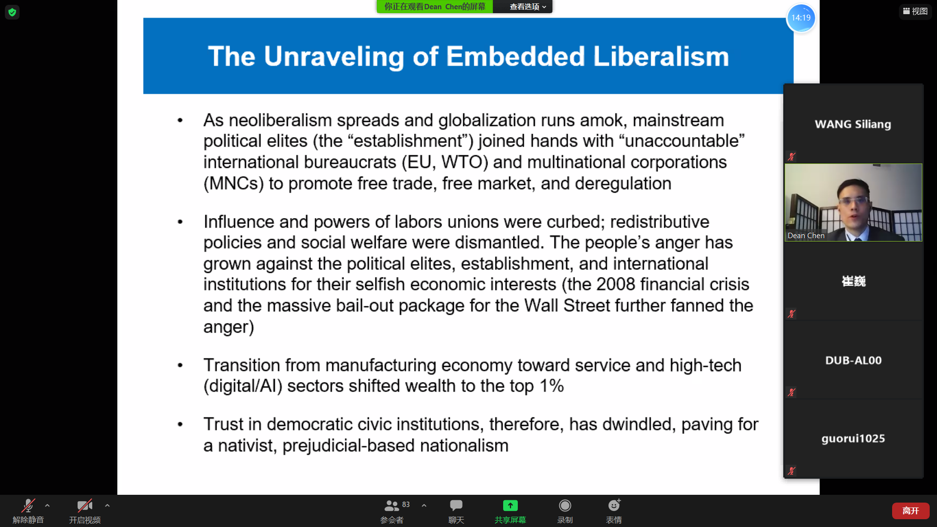 陈鼎副教授从自由主义的产生与瓦解、本土主义与民族主义的兴起、经济困境与民粹主义的产生等角度出发,配合多样化的统计对比图表,立足历史沿革、经济影响、全球化与移民等视角,剖析了民粹主义兴起的深层原因。