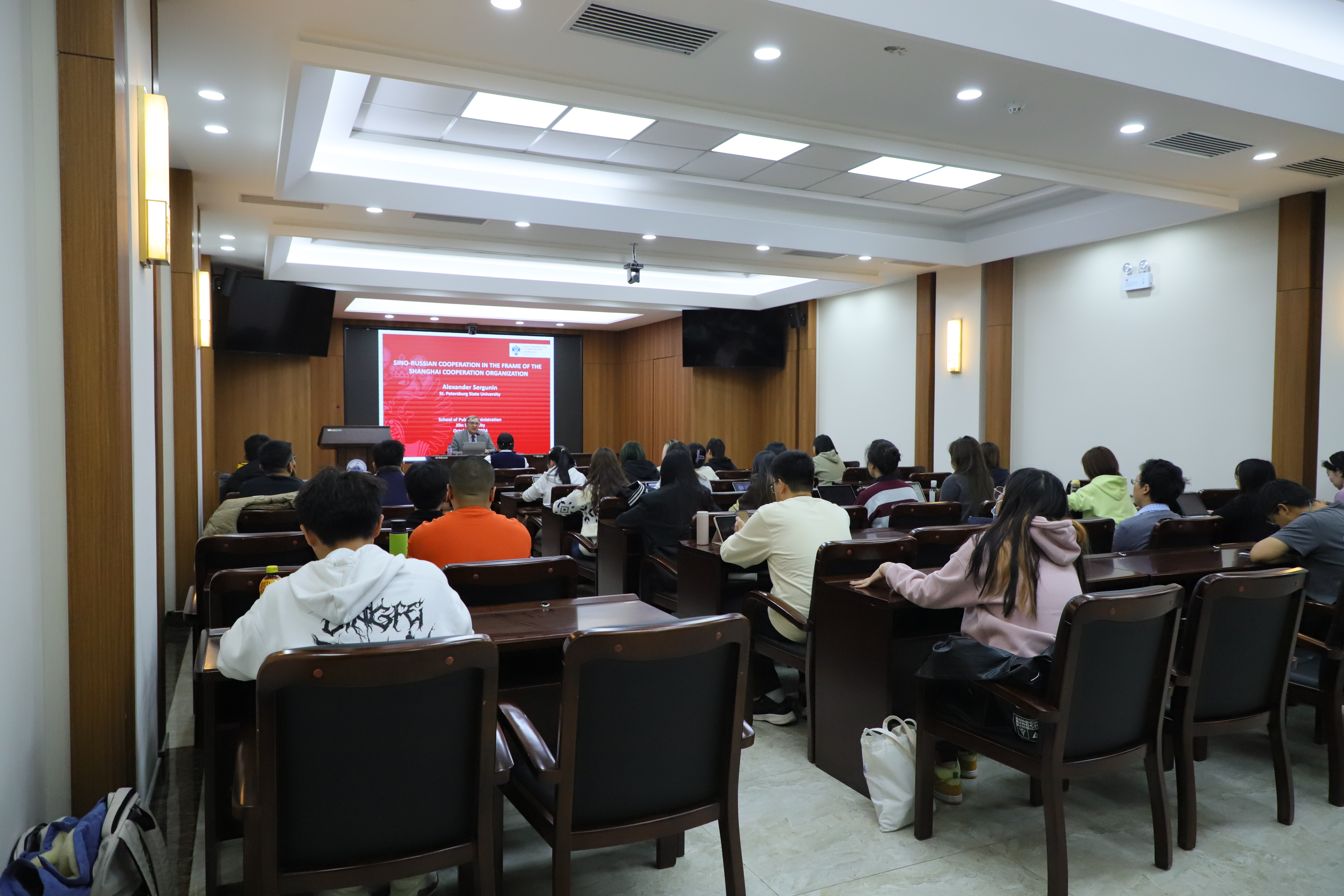 谢尔古宁教授首先介绍,此次讲座主要探讨上海合作组织背景下中俄合作的潜在领域。他认为,上合组织因其在政治、军事、经济领域所拥有的巨大潜力对俄罗斯的发展十分重要。在阐明了上合组织的重要性之后,谢尔古宁教授分享了中俄两国建立新型安全模式的倡议,即着眼于整个欧亚大陆的需求,并以多极化原则为基础,建立互惠共赢的多边国际组织,同时分享了基于上合组织框架下的贸易战略和计划。教授提到,在上合组织的框架下,中俄合作议题涵盖国家发展议题的方方面面,同时教授也点明了上合组织当前需要创建新型的自主结算和支付机制,发挥双边合作平台的优势,避免身份危机的发生。在总结环节中,谢尔古宁教授提到明年中国将担任上合组织的轮值主席国,而中国具有很高的国际声望、巨大的政治和经济资源,具备实施上合组织框架下各类倡议的能力,因此上合组织的各成员国都对北京将于明年成为上海合作组织的领导者充满期待,而俄罗斯也将会同中国开展更为紧密地合作并加强上合组织的建设。