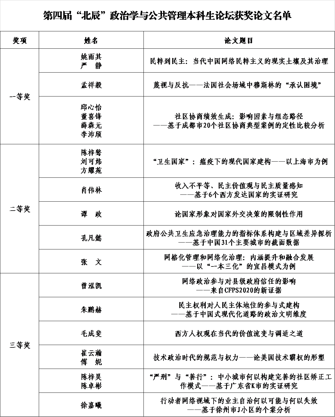 第四届“北辰”政治学与公共管理本科生论坛自公开征稿以来,受到全国各大高校的广泛关注。至2022年5月12日征稿截止,组委会共收到来自全国78所高校本科生投稿135篇。经过专家评审、线上展示等环节,评选出一等奖3篇,二等奖5篇,三等奖6篇,现予公布。