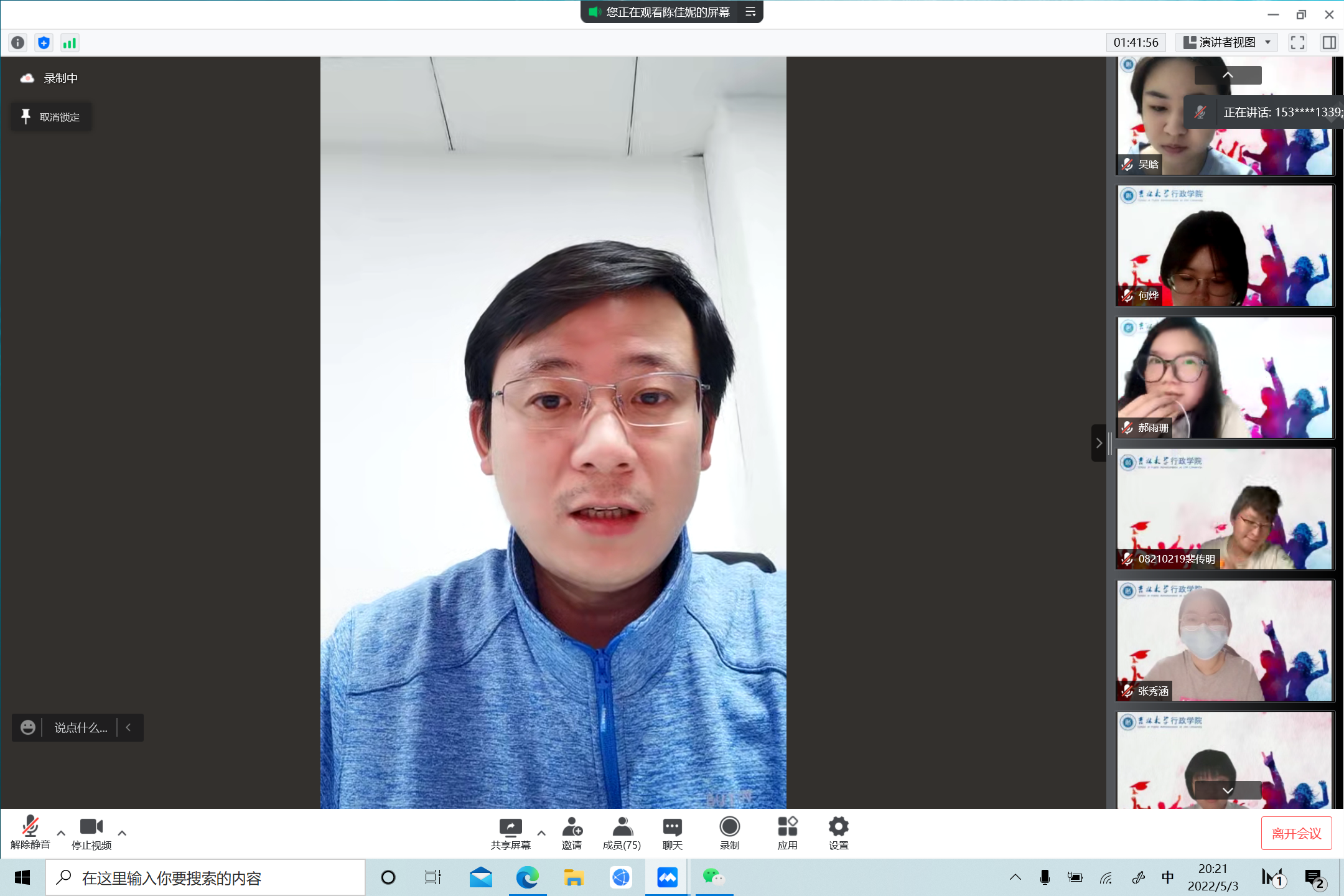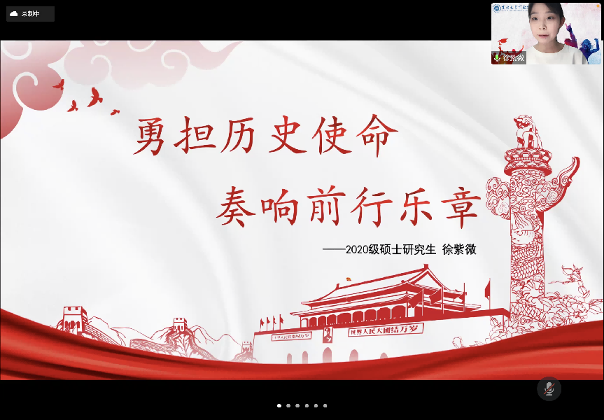 优秀员工代表与青年教师代表依次进行了发言。公司“青年学习班”代表曹阳、研究生代表徐紫微分享了公司疫情防控中志愿者的防疫记录和个人心得感悟,提振疫情防控信心;员工社团代表张志强、团支部书记代表张云航总结并介绍了疫情形势下社团与班级工作的开展情况,并结合“五·四”精神鼓励大家追逐青年梦想,争做时代新人;优秀记者代表陈聪表示将为提升公司团委宣传工作而继续努力,立足于“公共精神、独立人格”的院训,加强宣传工作的深度,对内提升亲和力、对外提高影响力;志愿者代表赵蕊、优秀共青团员代表卫玉欣分享了疫情下吉大人、行政人的勇毅担当,表达了对逆行而上、勇挑重担的志愿者的敬意和感谢;员工组织成员代表于润泽介绍了应急管理期间公司员工会的工作开展情况,表示员工会将在未来继续发挥好凝聚同学、服务同学的作用;“青马工程”学员代表王上华分享了自己在院校两级青马工程培训班的经历,并号召共青团员们发挥先锋模范作用,躬身实践、知行合一;“思源计划”学员代表卢婷从参加计划调研活动的经历与体会着眼,抒发了行政学子脚踩泥土、眼望星辰的情怀;就业毕业生代表王鹏解答了同学们关心的就业问题,指出在求职过程中应脚踏实地、积极调整自身心态、不断积累经验,抓住自身定位精准出击。优秀青年教师代表张力伟以责任担当为主题进行了主题发言。张力伟号召同学们坚定思想信念,走出书斋、走向社会,充分认识到自我主体性与对国家民族未来的责任担当,将担当化为行动,勉励同学们立足于青年政治学人、公共管理人的身份,培养理性冷静的学科立场,保持对时代与社会发展的敏感度,在学习实践中挖掘中国故事、更好地阐述中国故事。