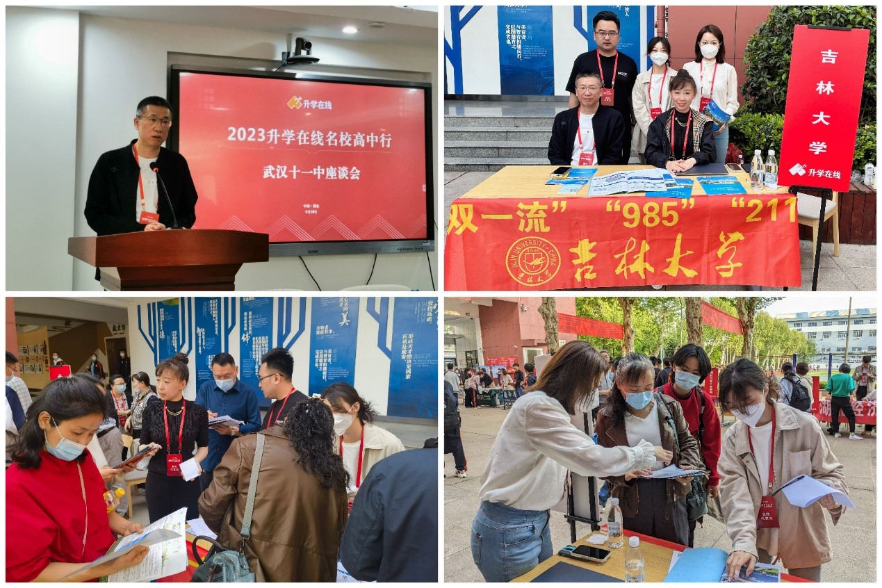 在武汉市第十一中学,刘雪华、刘畅、张力伟、高卓嫱、王斯靓一行5人参加“升学在线名校高中行”武汉场次活动。座谈会环节,刘雪华向武汉市第十一中学陶勇董事长、武汉市第三中学张才清副董事长、武汉新洲区第一中学任红斌副董事长与高校同仁介绍了关于我们、转专业与“日新计划”新政策及2022年公司在湖北省招生基本情况。座谈会后,刘雪华与张才清亲切会面,双方回顾了2018年yl23455永利本科招生宣传工作组在武汉三中建立公司“优秀生源基地”的过程,分享了近年武汉三中学子报考公司情况,并就下半年开展本科招生宣传活动的时间安排进行初步确认。