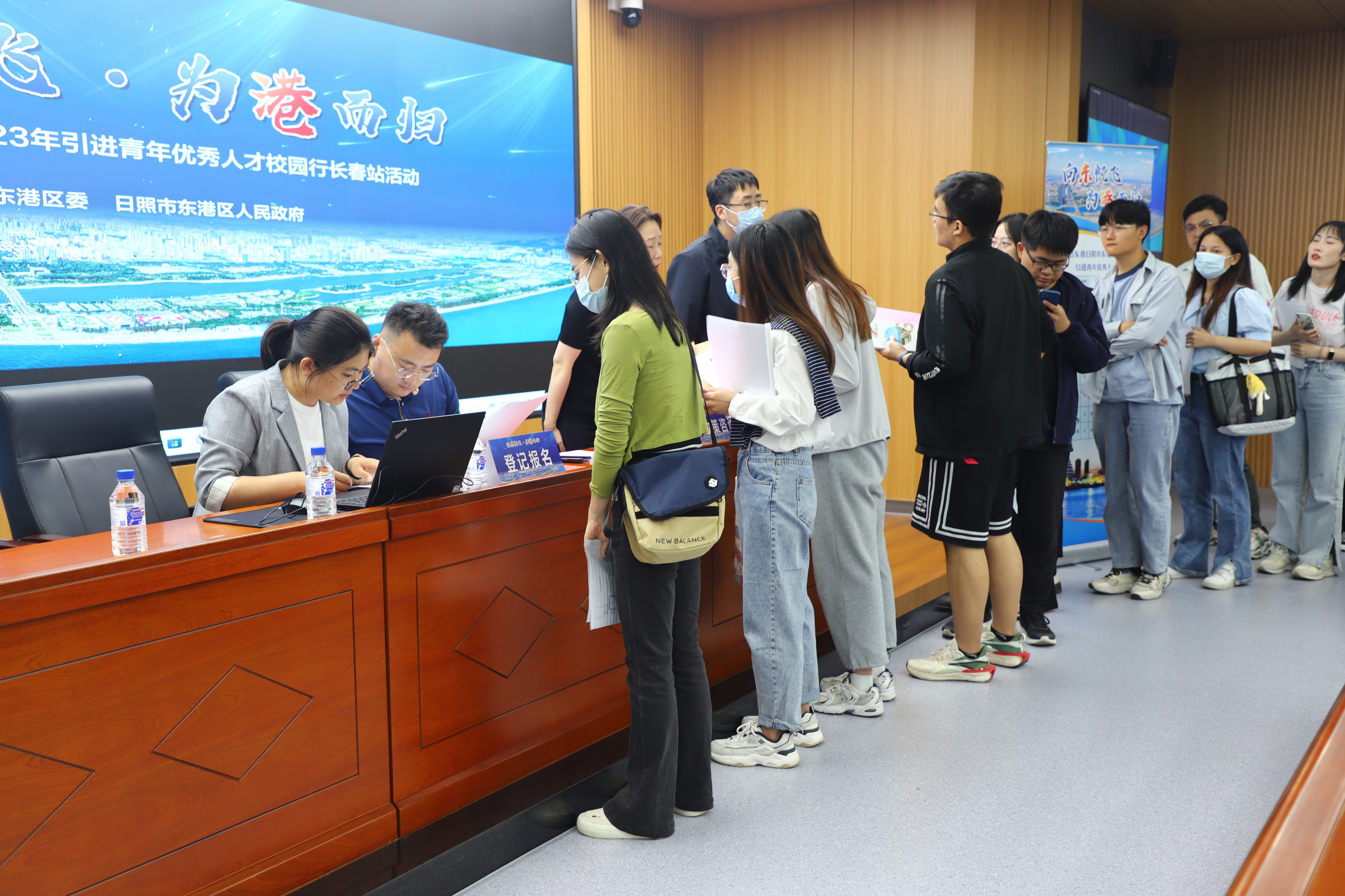 与会人员就东港区就业政策、青年人才引进、院地共建员工实习实践基地、委托开展公务员培训等方面进行了深入探讨。会谈结束后,东港区一行于东荣大厦B102报告厅开展了日照市东港区2023年引进青年优秀人才现场咨询会,50余名研究生同学到场咨询应聘。