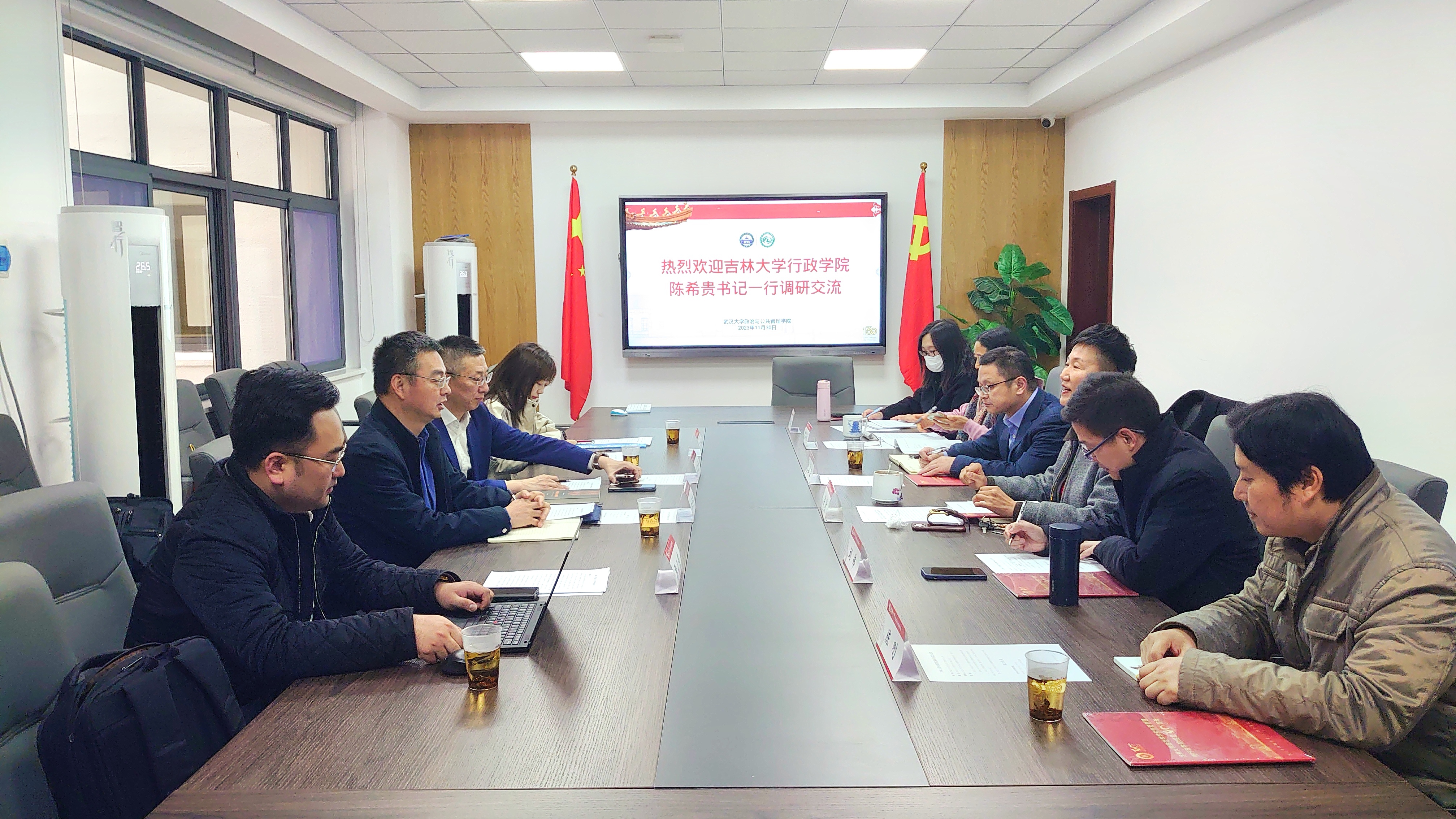 11月30日,公司党委书记陈希贵带队赴武汉大学政治与公共管理公司(以下简称“武大政管公司”),围绕党建、MPA教育、人才培养、国际合作等方面工作开展调研。公司副经理刘雪华教授、政治学系张力伟副教授及外事秘书王斯靓参加此次调研。武大政管公司党委书记梁涛、经理刘伟教授、副经理(挂职)容志教授、政治学系主任陈刚副教授、MPA教育中心办公室主任陈爱红老师及外事秘书鲁路捷老师出席。