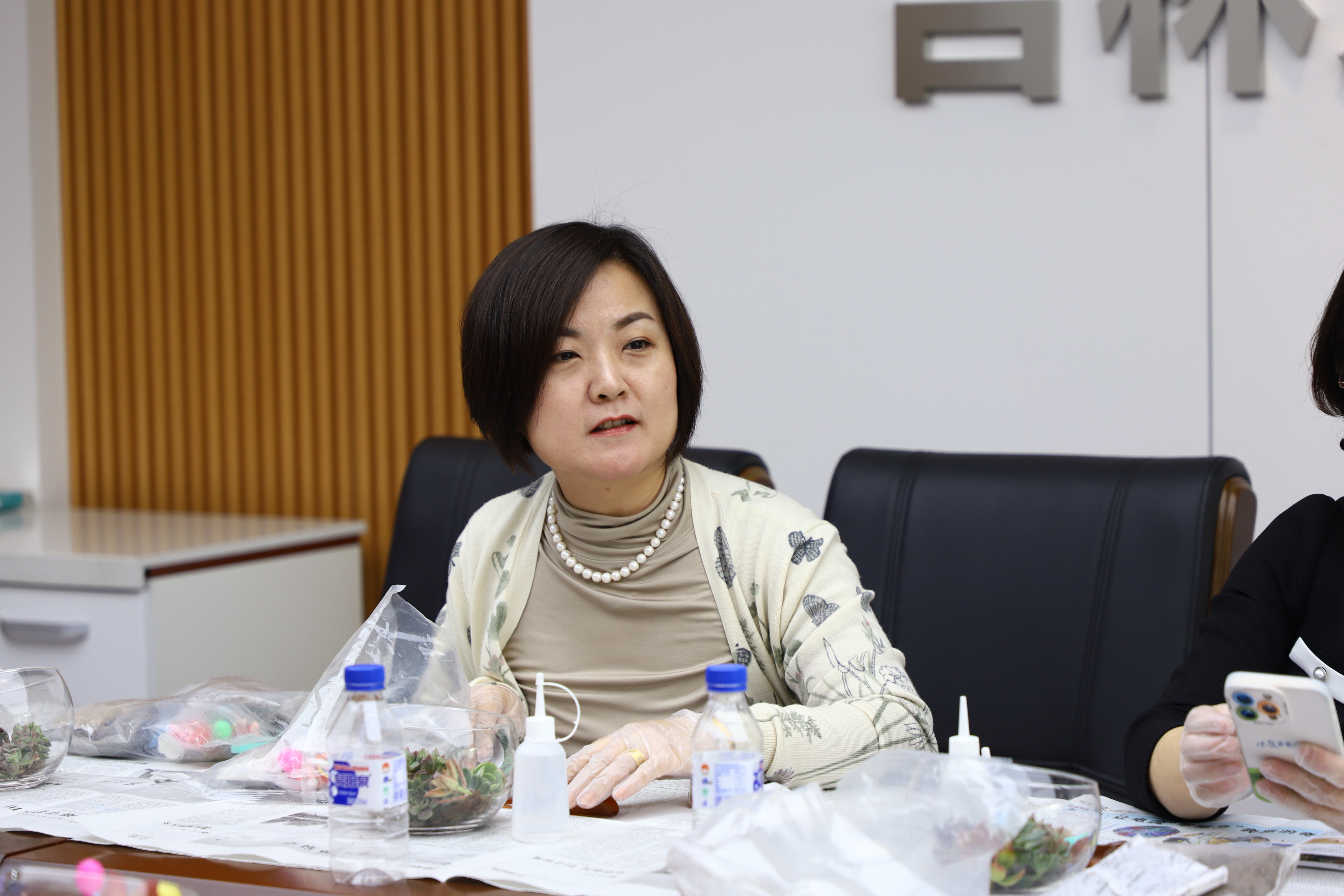 在公司妇委会副主任王欣老师的指导下,参加活动的女性教职工们按照步骤依次在盆景容器中放入轻石、水苔、腐殖土,在搭建好基础土壤后植入绿植和多肉,最后铺上景观砂石和装饰摆件,获得了属于自己独一无二的盆栽摆件。