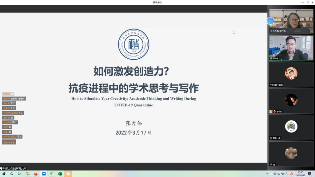 史慕华教授首先介绍了“研究生学术能力提升计划”及本次学术讲座的目的,强调疫情封闭期间合理规划时间、进行学术思考、提升学术研究能力的重要性。讲座中,张力伟老师首先提出了学术思考与写作的重要性问题,并结合自身经历分享了2020年上半年疫情来临时居家隔离期间写作的学术成果,讨论了如何培养学术意识、发掘学术问题,鼓励同学们关注学科前沿、学科热点,要善于从政策文本、理论检讨、现实经验中发现新问题,并养成定期浏览学术信息的习惯,争取做好能够剖析问题、拆解问题。此外,张力伟老师分析了提升学术写作能力的几种方法,包括日常生活中多阅读、多积累、多练笔,和老师同学保持良好的学术沟通,基于学术兴趣开展跨学科合作等等。最后,张力伟老师再次结合个人经历强调了培养学术视角与专业素养的重要性,希望同学们打通“书斋”与“田野”,在夯实理论功底的同时放眼社会,彰显政治学与公共管理学人的责任担当。