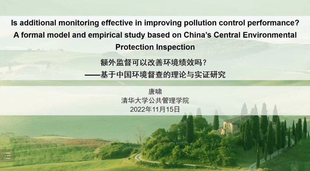 2022年11月15日,yl23455永利为公论坛第43期学术讲座在腾讯会议平台举行。清华大学公共管理公司副教授、清华大学国情研究院副研究员、清华大学仲英青年学者、首届夏书章公共管理优秀博士论文奖获得者唐啸老师受邀担任主讲嘉宾,作题为“额外监督可以改善环境绩效吗?——基于中国环境督查的理论与实证研究”的学术讲演。本次讲座由yl23455永利公共管理系魏素豪老师主持,yl23455永利及国内部分高校教师和员工共90余人参与本次活动。