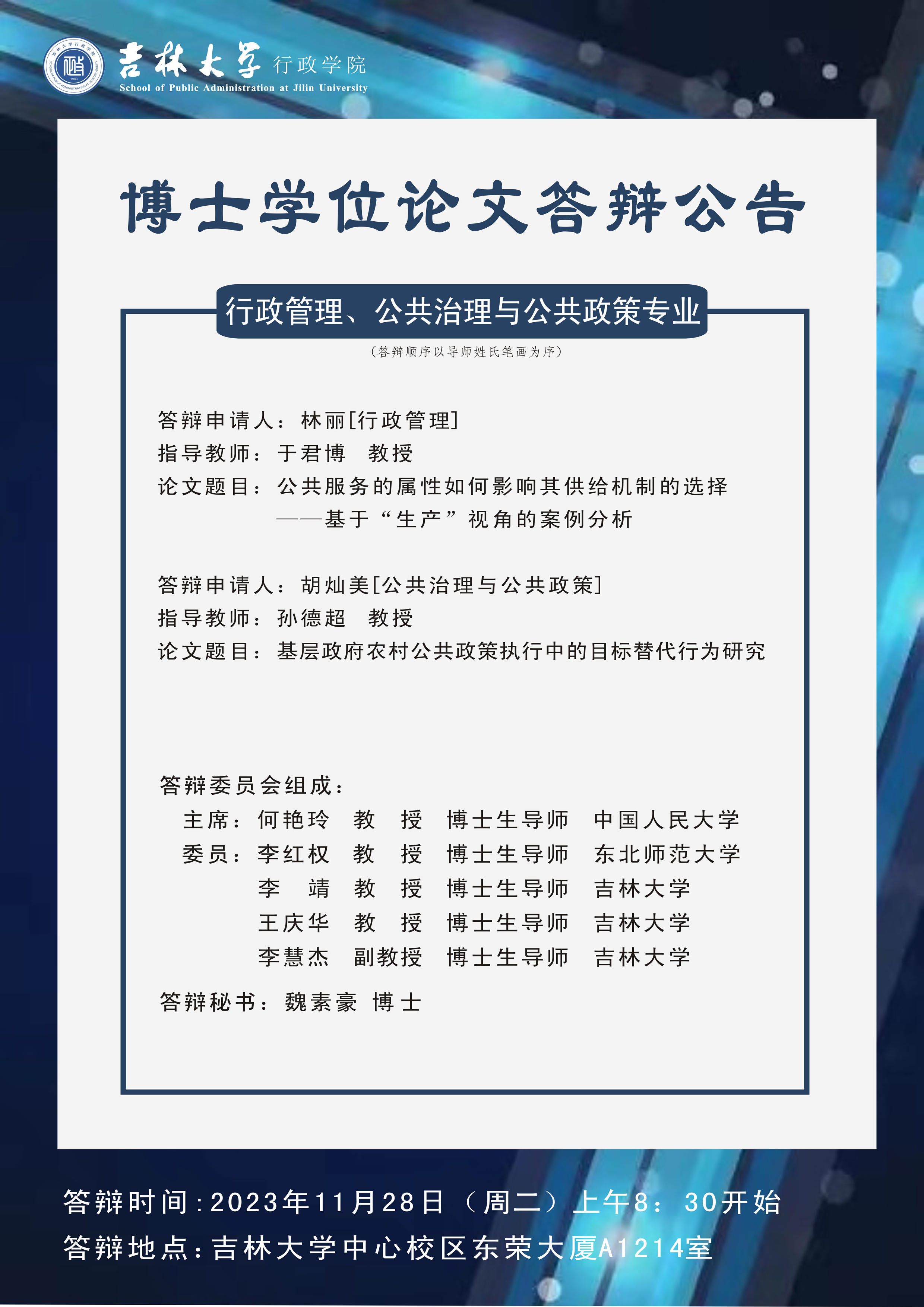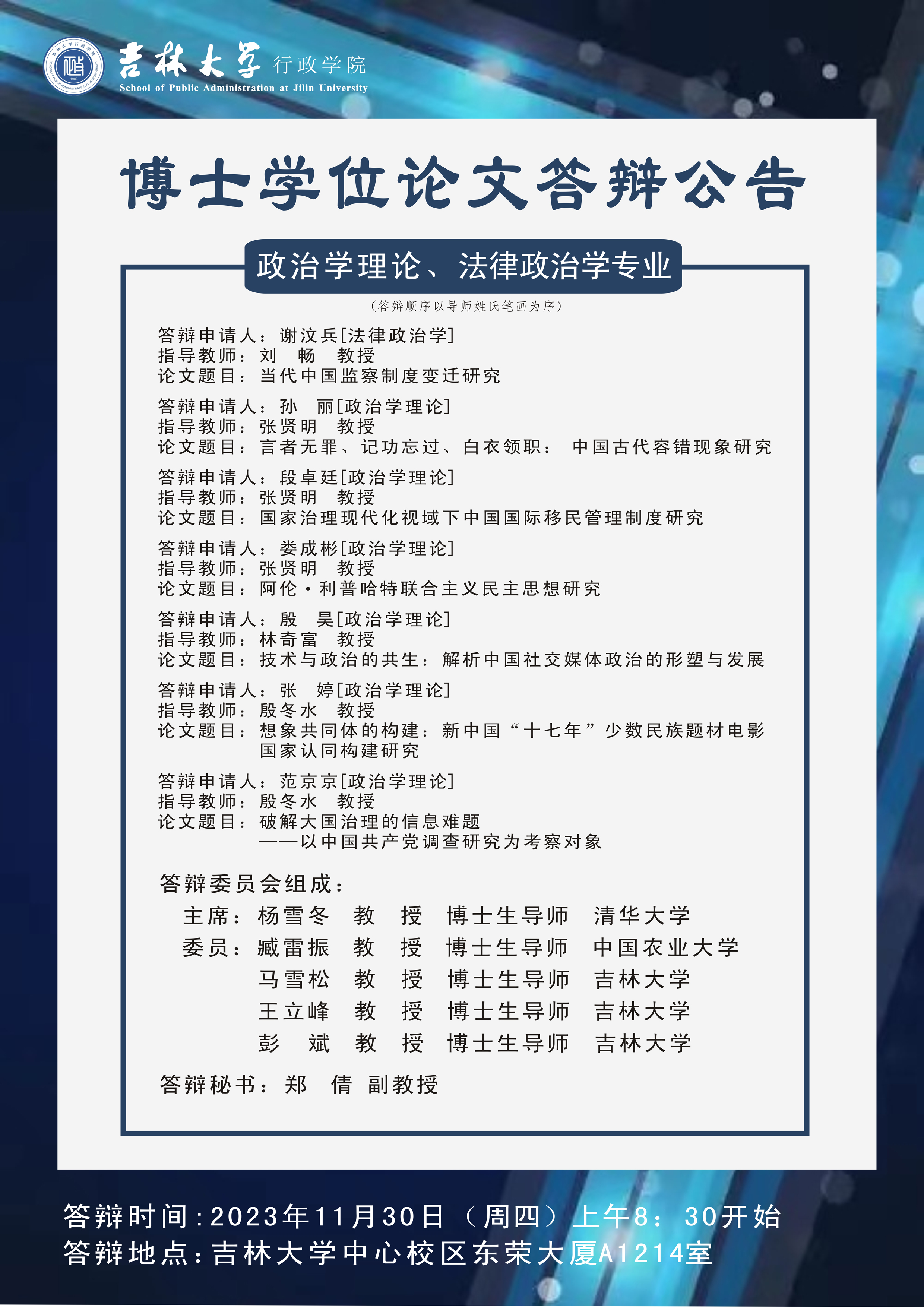 第一组:行政管理、公共治理与公共政策专业-博士学位论文答辩:2023年11月28日(周二)上午08:30开始,答辩地点:yl23455永利中心校区东荣大厦A1214会议室
