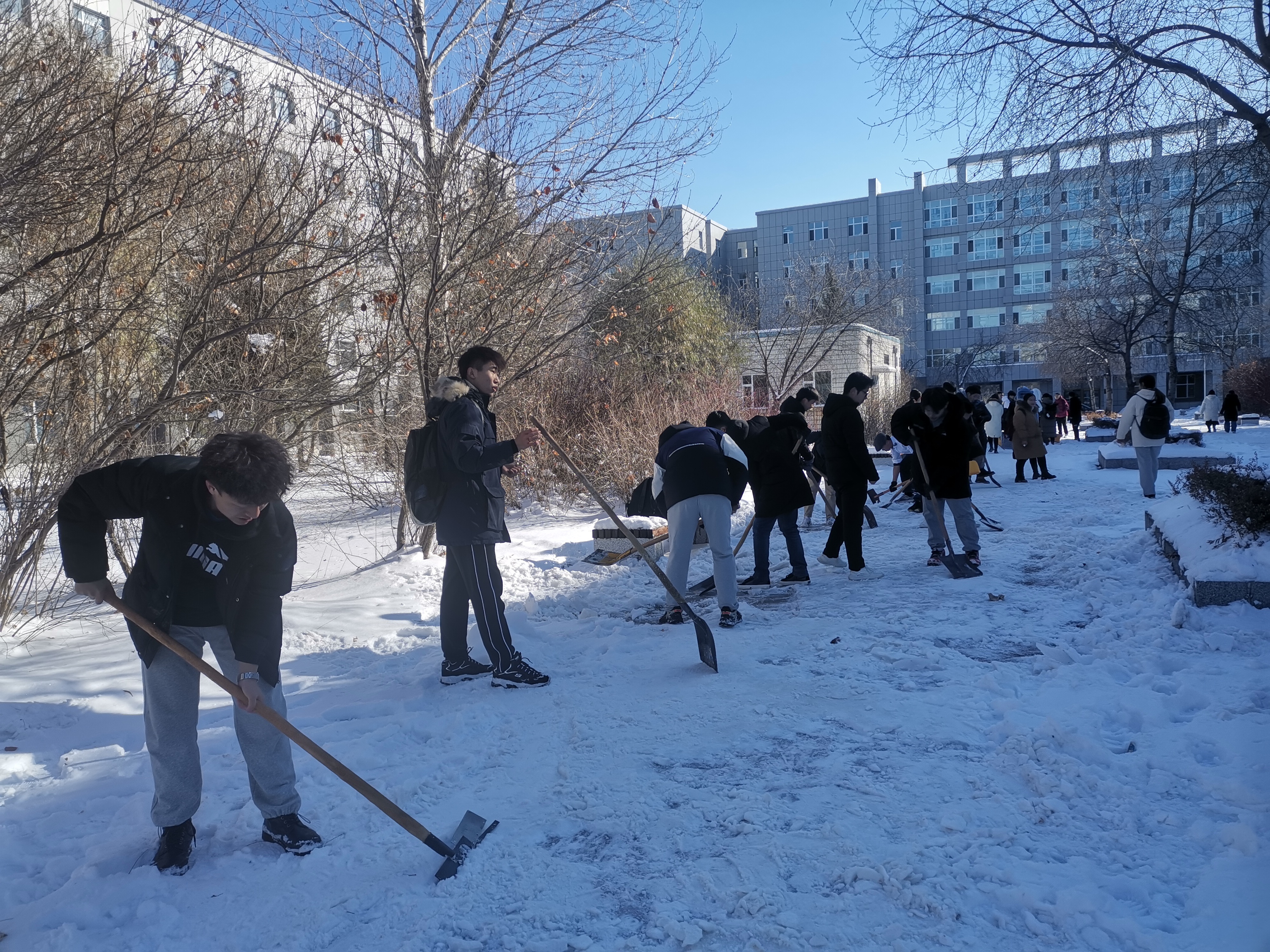 清雪现场,大家在克服一切困难,发扬不怕苦,不怕累的精神,手拿铁锹、笤帚干劲十足地投入到清雪战斗中,不畏寒冷,人人争先,为师生出行开辟出一条洋溢着温情的道路,充分展现了党员的服务风采,增强了党员队伍的凝聚力。