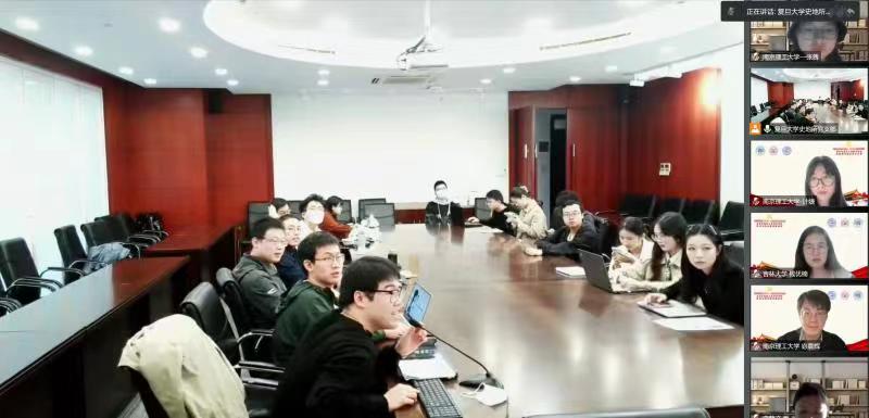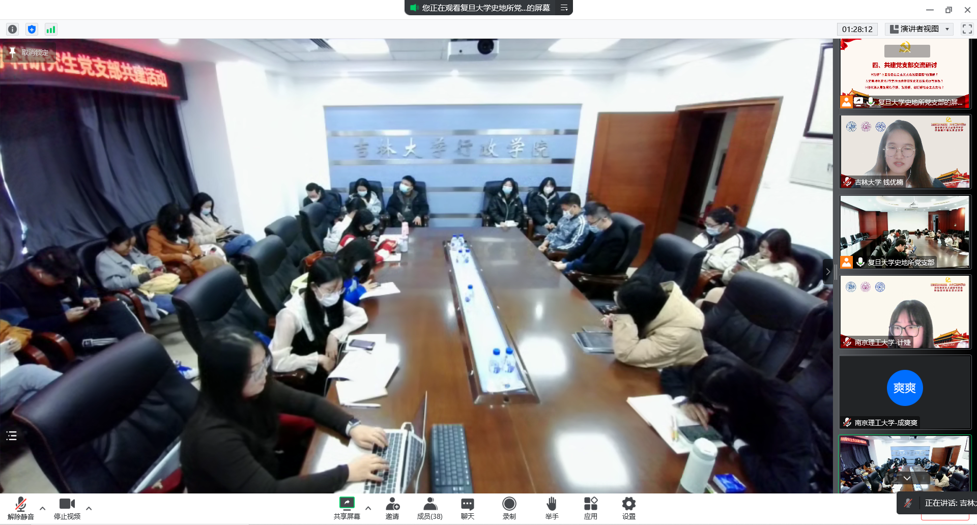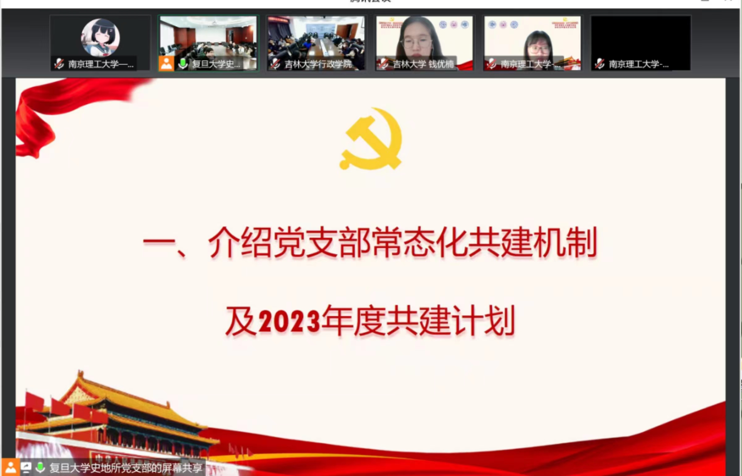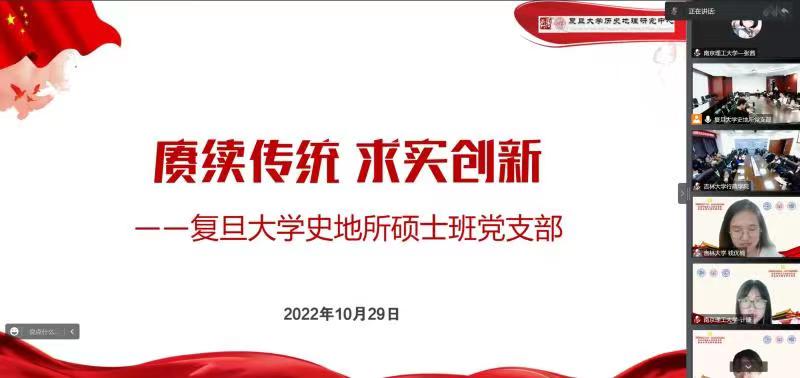 复旦大学史地所硕士班党支部书记盛灏成和南京理工大学公务公司公共管理硕士党支部书记计婕也分别围绕史地所对文化的传承、“中华民族共同体意识培育的新样板”进行了介绍。南京理工大学发展规划处副处长赵珂对本次共建活动作出亲切交流。