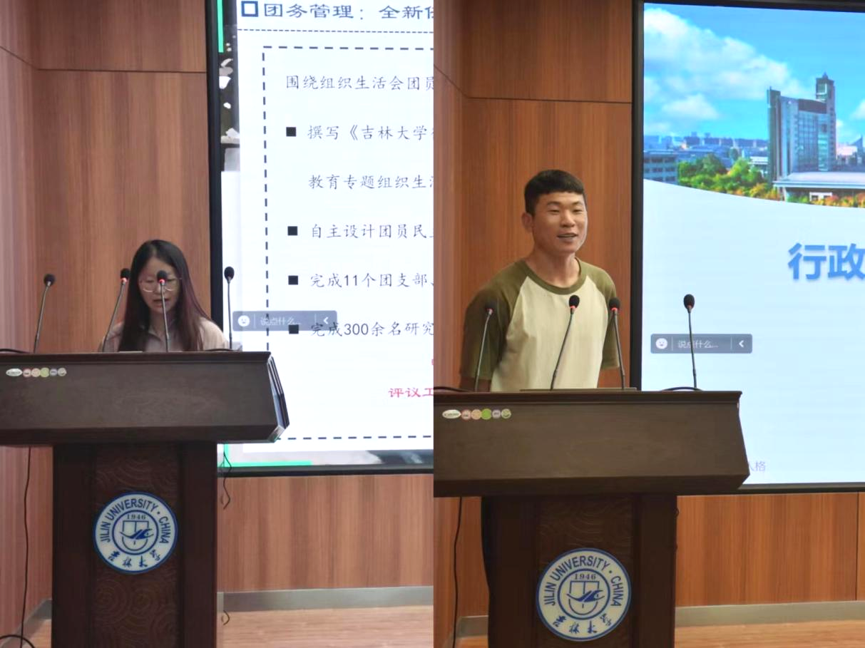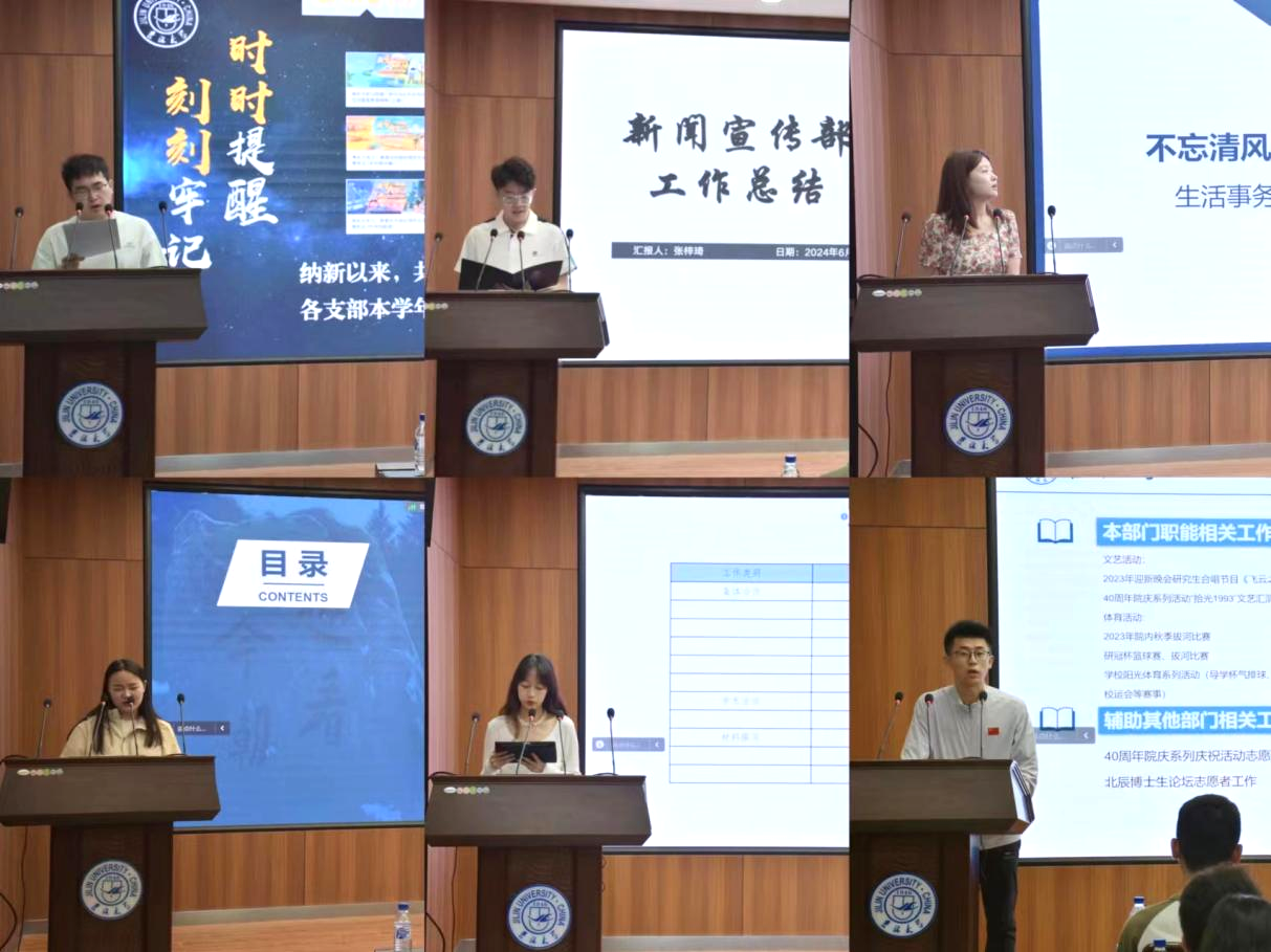会议伊始,团学组织各部门负责人依次进行工作总结汇报。组织建设部负责人金浩楠从部门日常工作、部门特色工作、部门重大工作以及院院联动工作四个部分展开汇报。新闻宣传部负责人张梓琦从本职工作完成情况、部门成员参与团学工作情况、新闻宣传部未来发展三个方面总结工作内容。生活事务部负责人王思源围绕求职创业补贴材料审核、研究生寝室安全检查、标兵宿舍评比等工作对部门工作任务进行了总结。发展指导部负责人冯思嘉详细介绍了部门所开展的暑期实习实践分享会、往届生就业经验分享、组织实习实训讲座等活动。学术文化部负责人于默暄从集体合作、学术活动、材料撰写、日常工作、线上工作五个方面梳理过去一学年的工作成效。文艺体育部负责人张景国对公司迎新晚会、公司“院系杯”、“研冠杯”、“导学杯”等文体活动进行回顾。