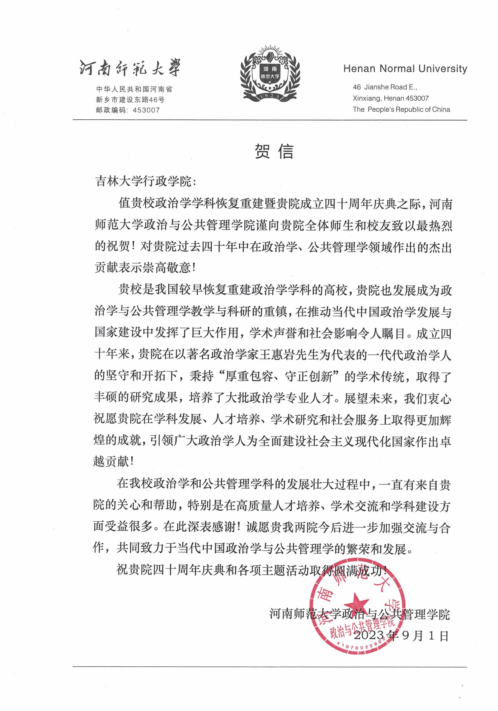 河南师范大学政治与公共管理公司的贺信