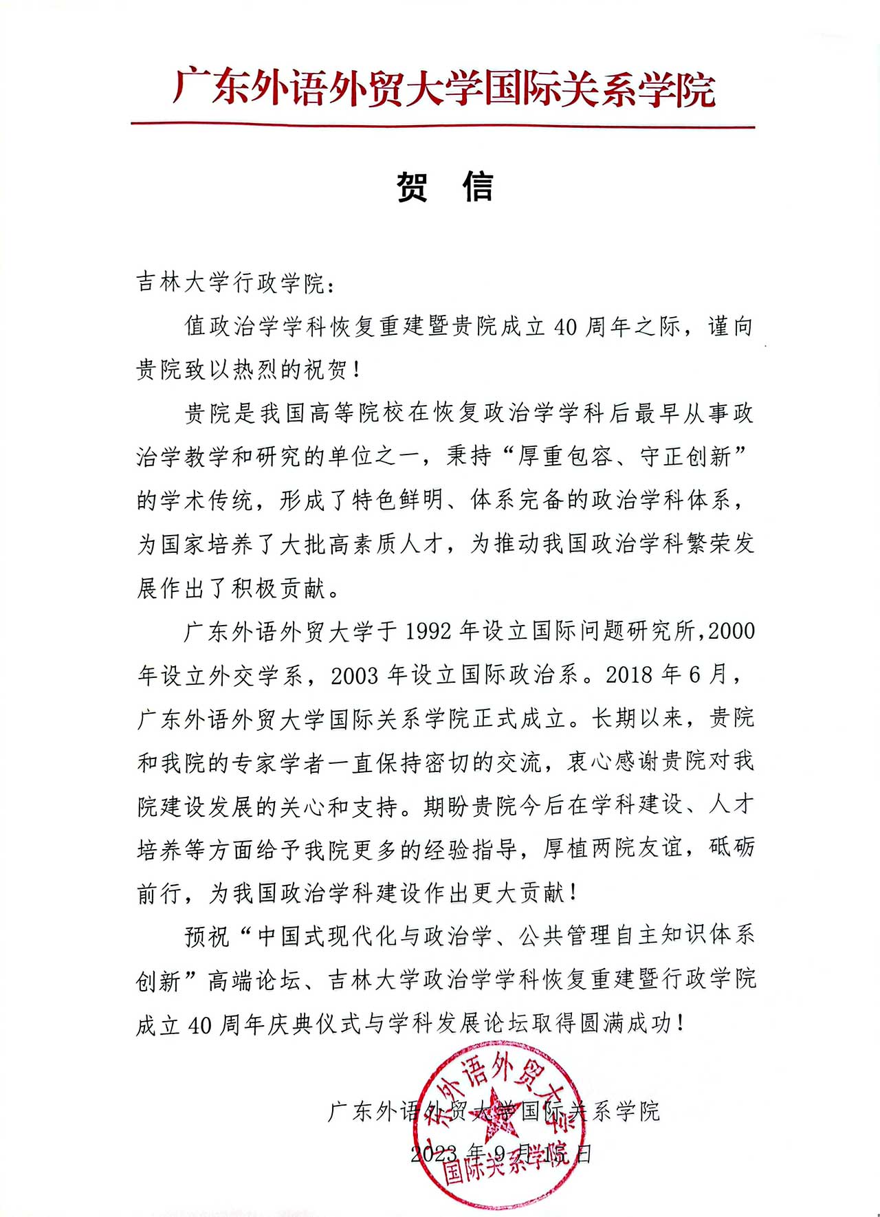广东外语外贸大学国际关系公司的贺信