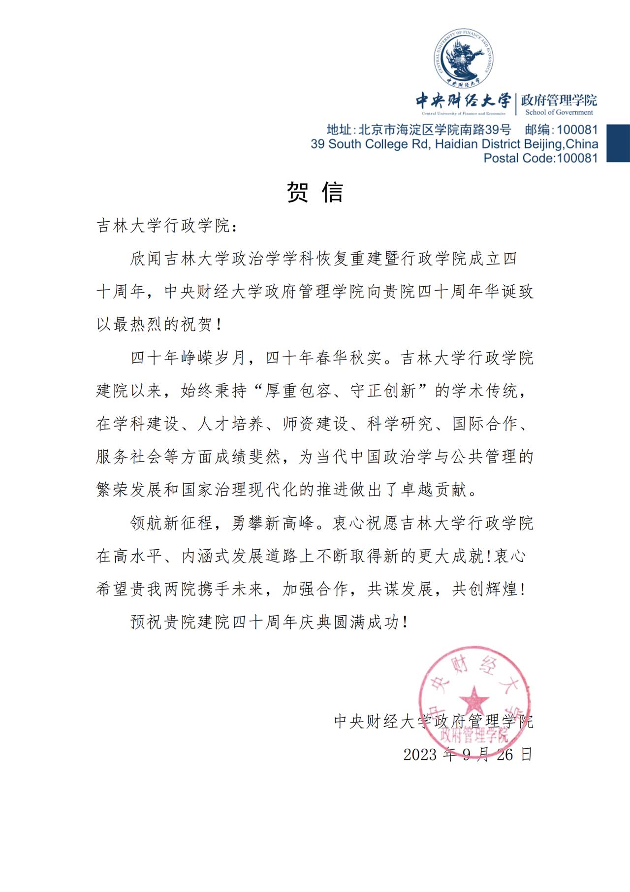 中央财经大学政府管理公司的贺信