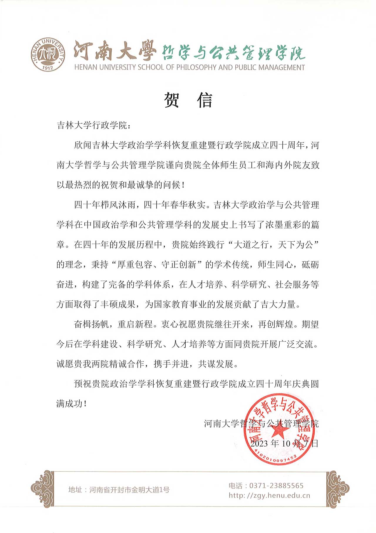 河南大学哲学与公共管理公司的贺信