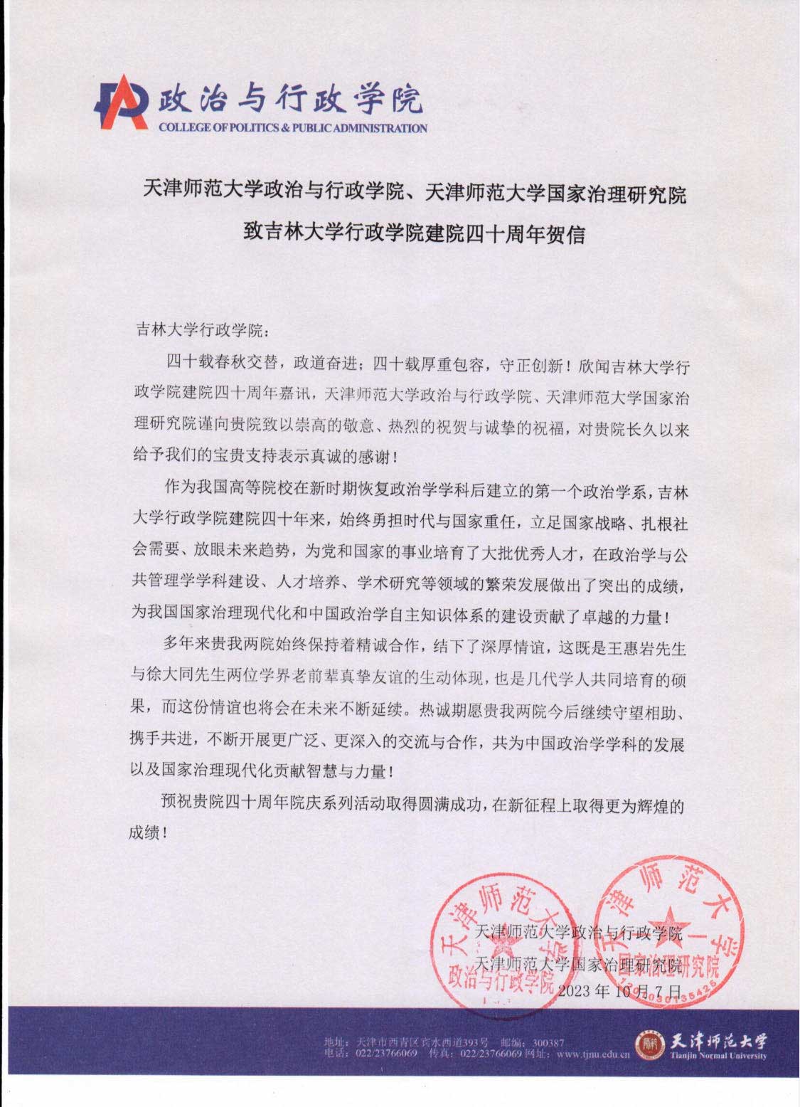 天津师范大学政治与yl23455永利、国家治理研究院的贺信