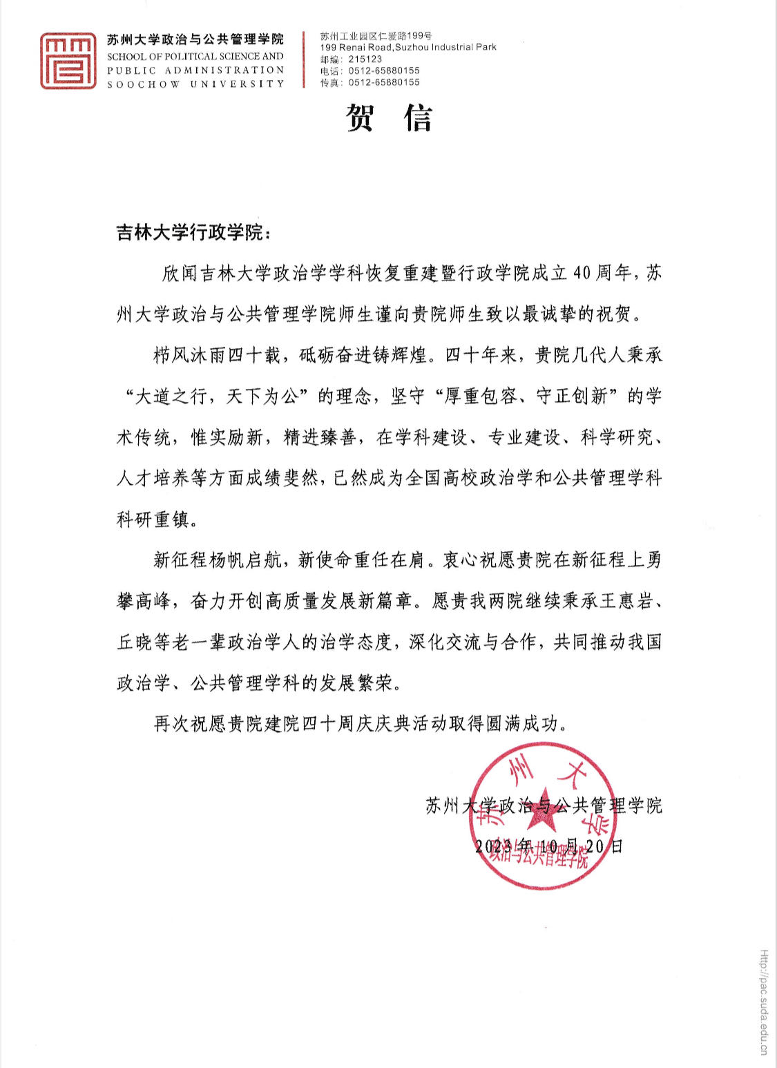 苏州大学政治与公共管理公司的贺信