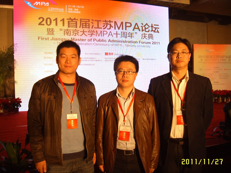 由南京大学政府管理公司、南京大学MPA教育中心、《浙商》杂志社共同主办的2011首届江苏MPA论坛暨南京大学MPA教育十周年庆典于2011年11月27日在南京绿地洲际酒店举行。公司MPA教育中心副主任王郅强副教授和2007级张斌阳、2008级唐克两位MPA研究生代表受公司委派参加了此次论坛与庆典。