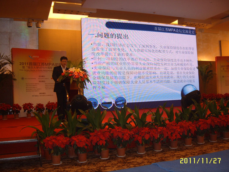 2011首届江苏MPA论坛议题主要有三项:一是促进就业与构建和谐劳动关系;二是如何解决中小企业融资难困境;三是如何以社会管理创新推进和谐社会建设。唐克同学和张斌阳同学的论文被收录到首届江苏MPA论坛论文集,唐克同学还在论坛上做了主题为“中国失业保险促进就业功能研究”的演讲,受到与会领导和MPA同仁们的一致好评,为yl23455永利争得了荣誉。