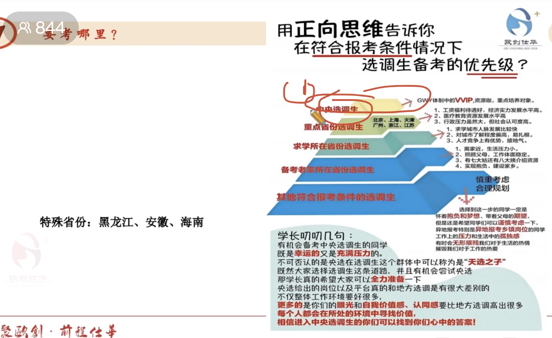本次宣讲会主要围绕“选调考试信息差的重要性?”“定向选调生的红利还能持续多久?”“定向选调的报考范围有哪些?优先级如何划分?”“笔试内容和国考有什么区别?”“东三省、京津冀、晋鲁豫的考情内容有何区别”五个核心问题展开。